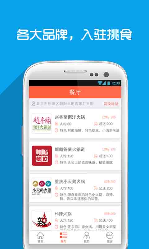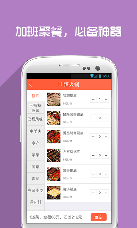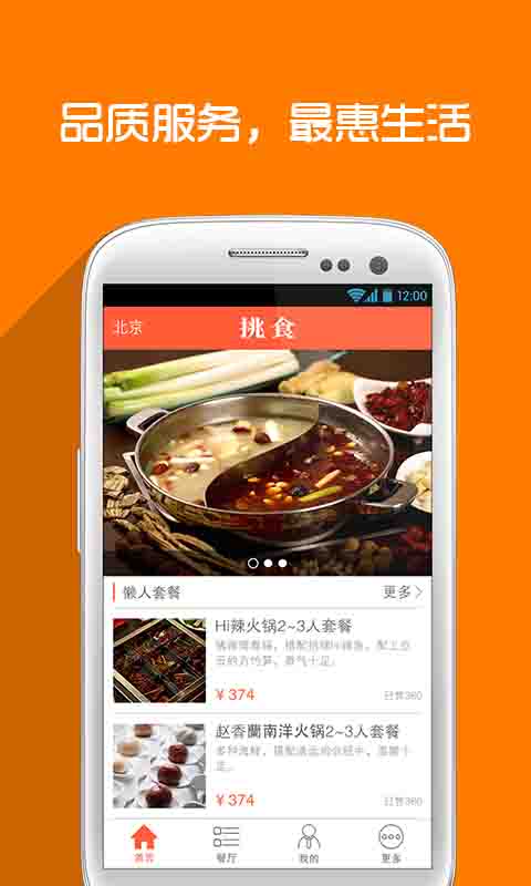 为用户提供火锅美食到家服务,在挑食上可以选择包括金簋小山城、香天下四川火锅、Hi辣火锅、赵香兰南洋火锅铺、重庆小天鹅火锅、麒麟锦庭火锅道、老诚伊羊蝎子、八巴兔重庆火锅、烹然四季椰子鸡火锅、滇草香云南原生态汤火锅、箩箩酸汤鱼火锅、杨家秘笈重庆火锅、珍菇源健康营养火锅在内的二十余家、不同特色火锅美食,挑食为用户提供火锅到家的餐前、餐后服务。