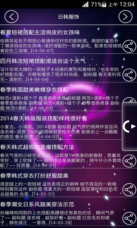 俗话说:人靠衣服,马靠鞍! 还在为穿什么衣服绞尽脑汁吗?还在为新买的衣服着急怎么搭配吗? 该应用以服装搭配为素材,介绍服装在不同场合下的搭配方法以及服装颜色搭配方式。主要分为服装搭配、颜色搭配两大类。让你在不同季节、不同场合都能与众不同,吸引众人的目光。 应用介绍搭配原则,以图片展示为主,附上文字介绍,清纯、成熟、性感、迷人...想要什么风格,就可以让你穿出什么风格。对于自己喜欢的搭配,可以通过微博、短信等方式分享给好友,让更多的人穿出自己的style!