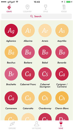 Plonk 对于葡萄酒入门者来说是个非常简单而实用的红酒 app。只须回答 3 个问题,便可找到更符合自己偏好的葡萄酒类型。除此之外,Plonk 的界面非常人性化,将葡萄酒按照葡萄、产地、类型、食物分为四大类,并按照葡萄酒的颜色显示。除了提供葡萄品种的原产地、品鉴记录之外,Plonk 还能提供实用的葡萄酒发音指南。Plonk 同样具有社交功能,相比 Delectable,Plonk 的用户比较年轻,展示的葡萄酒价格不会那么昂贵,氛围也更加轻松。