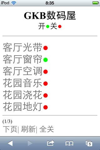 2、登录后,即可对灯光电器进行查看控制。可根据显示灯的显示(红/绿)确定电器的运行状态,“红”代表关、“绿”代表开。