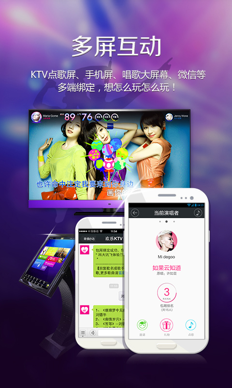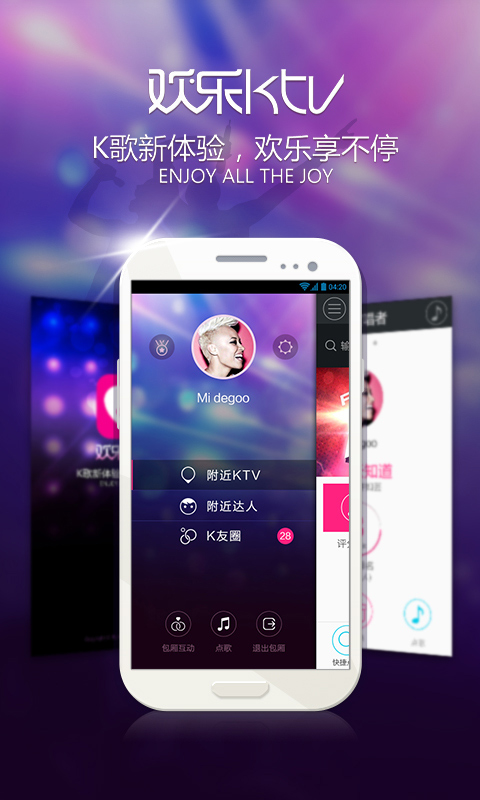 K歌新体验,欢乐享不停!欢乐KTV(原名:欢乐K歌),一款让包厢氛围更HIGH的音乐互动App。 扫描二维码,即可绑定包厢,手机也是点歌机;精准评测,三维打分,谁是麦霸立见分晓;手机送礼,屏幕绽放,在KTV的任意角落都能和好友互动交流,还有独家首创的语音点歌系统等你来体验。 欢乐KTV产品特色: ★绑定包厢,手机点歌 通过扫描KTV包厢内点歌面板上的“手机互动”二维码,即可与包厢绑定。点歌、切歌、调整音量均可通过手机完成。 ★查找附近KTV及优惠活动 查找附近的KTV并支持一键导航和电话预定包房。查找附近KTV正在进行的优惠活动。 ★欢乐K歌,以歌汇友 发现附近的歌友和同包厢的好友,相互关注后即可查看相册,发送消息。 ★语音搜歌,乐享手机KTV 提供歌手点歌、文本搜歌、语音点歌和热门推荐等多种点歌方式,让您想唱就唱! ★道具互动,大屏喝彩 给好友送朵鲜花、献个飞吻、写封情书,让唱歌过程充满乐趣,和好友一起来唱吧!