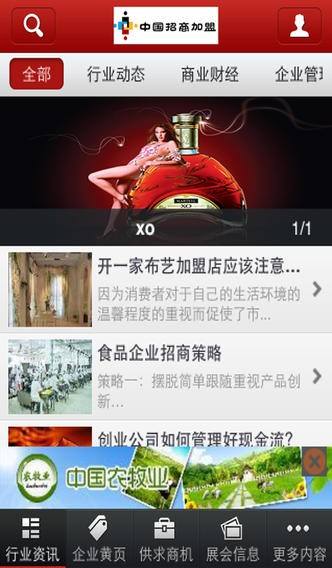 的扩 张能力和盈利能力最大化。同时,中国招商加盟客户端还致力于为中国庞大的创业人群,特别是中小创业者提供招商创业项目库、创业指导、创业心得、创业交流等 全面的创业需求服务,帮助创业人群进行创业项目选择、投资风险分析、市场营销指导、并在行业论坛进行创业经验分享,让广大创业者能够从中国招商加盟客户端 这个平台找到最丰富、最合适的创业资源,得到最专业的指导,进而帮助创业者优选项目,完成创业。
