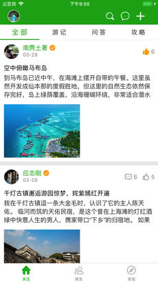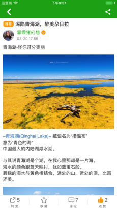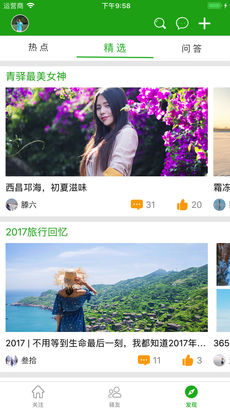 3、在青驿91直播看到的内容来自于你关注的用户和旅行地,千人千面,绝对没有重复和强制推送。当你发文时,内容会推送至你的粉丝,也会推送至旅行地页面,精准传天下;