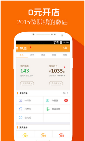 微店铺服务于淘宝卖家、熟人交易、代购等个体或商铺,支持商品管理、商城装修、订单管理、营销管理、销售和流量统计,同时支持一键分享至新浪微博、朋友圈等社交媒体。