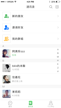 ④群聊:群聊列表,显示已有的群聊名称,点击可进入群聊天详情