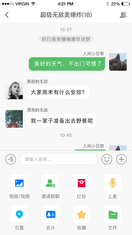 a.显示群头像,名字,点击可进入详情,显示聊天窗口,聊天内容,可发送文字,语音,图片,小视频,发起语音聊天,位置(发送位置)、收藏、群红包(可填写红包金额,抢的人数 发出。红包支付使用第三方支付宝支付),可点开全成员信息,添加好友(群人数500)