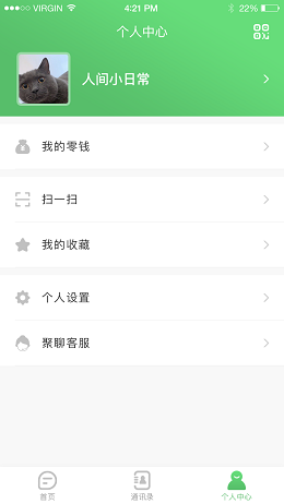 ①个人资料:头像、昵称,我的二维码(点击生成二维码-可用于扫码加好友)、聚聊号、个性签名、实名认证等功能