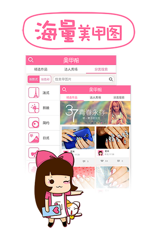 美甲帮——一个有爱、有趣、有料的美甲APP。你身边的美甲控都在用,海量的优质美甲资源免费放送! · 分类图片:分类精选最新最潮美甲款式,更有数十万美甲爱好者分享的最新美甲图。万千佳丽,总有一款属于你! · 精品教程:身边的免费美甲老师 - 独家功能——“求教程”帮你制作教程,详细直观的美甲教程,即看即学会; · 查找美甲店&团购:查找附近的美甲店和团购,不必再纠结去哪儿好,来一次想做就做的美甲吧! · 收藏与分享:从数十万图片中收藏美甲图片,集成自己的美甲相册,同时分享自己的作品给到数十万用户,美甲帮,帮甲美; · 每日精选内容:时尚编辑和画师,每天送上精彩的段子和美甲漫画,让每天都有小感动和小期待! 爱美甲,就玩美甲帮!