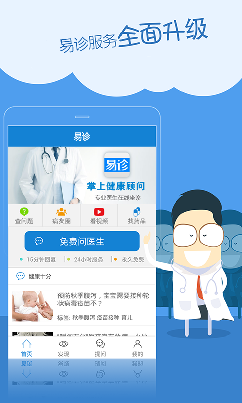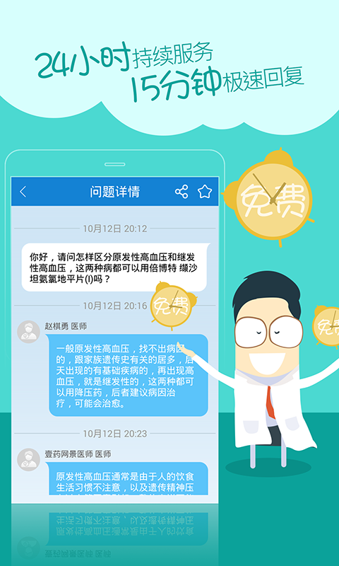 必须由医生回复,答案肯定靠谱;必须15分钟内响应,而且24小时候诊;必须永久免费,回慢了还送你钱!问医问药,必须健康! 四大独门功能 (1)问医生:执业医师全科覆盖; (2)搜问题:百万问答一搜即懂; (3)查药品:对症问药放心买药; (4)看视频:健康视频直观实用。 五重顶尖服务 (1)真正永久免费 (2)15分钟极速回复 (3)24小时持续服务 (4)问题加密隐私保密 (5)三甲名医天天候诊 我们希望为全球华人提供免费优质的移动医疗服务,从专业角度解决用户看病难、看病贵、花时间、感受差等问题。在众多的医患问答app当中,存在着诸多的问题,回答不及时、马虎随意、态度冷淡,甚至还需要为并不适用的答案付费。任何一个普通人,在有健康需求的时候最需要什么?我们从你的需求出发,于是有了《问医问药》。 为了解决你的健康咨询需求,我们不需要号称有几万个医生,我们只会要求每一个问题都由正规执业医师作答,因为你需要对答案放心;我们不会敷衍了事,因为你需要答案真正实用有帮助;我们不会慢悠悠回复,因为你在这一刻急切需要帮助;我们还不会收费,即使医生回复你的问题我们需要支付费用,我们都愿意为你永久承担。 看病治病,还要对症下药。我们结合最完整的药品数据库,并且汇集使用过这些药品的用户问题和药师回复,为你选药找药的时候提供全面的参考信息和最便捷的正规网上购买渠道。补充健康知识,没有什么形式比看视频更为直观简单,于是我们独创了健康视频功能,随时观看和上传分享,谁都可以帮助更多人改善健康。 我们不满足于“轻问诊”,所以我们不断邀请三甲医院名医为大家提供限时免费的在线咨询服务,最痛苦的问题、最难治的疾病、最难约到的医生,我们都希望能努力为你创造机会。但是请你谅解,名医的时间有限,我们只能优选最具备普遍意义或者疑难度高的问题求助名医,也请你相信,我们的名医一定会越来越多。 我们还小,但是我们很用心;我们在尝试,但我们一定会坚持。因为我们都在想——必须让更多人健康!