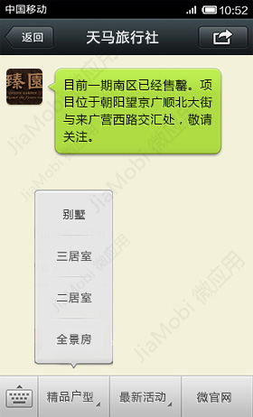 楼盘的公众平台更要承载出信息公示的作用,将楼盘的所有信息向业主、潜在顾客公示,真正的建立一个楼盘、业主、顾客、业务的掌上楼盘平台。
