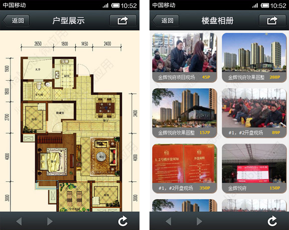 利用户型相册、楼盘相册、楼盘实景等画册的形势,直观的展现楼盘、户型的照片、介绍。