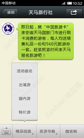 将旅游信息发布在微信端,构建一个用户可以随时查阅,信息可以被粉丝分享的移动端旅游平台。不仅可以服务现有客户,更能扩大客源,让品牌移动化。