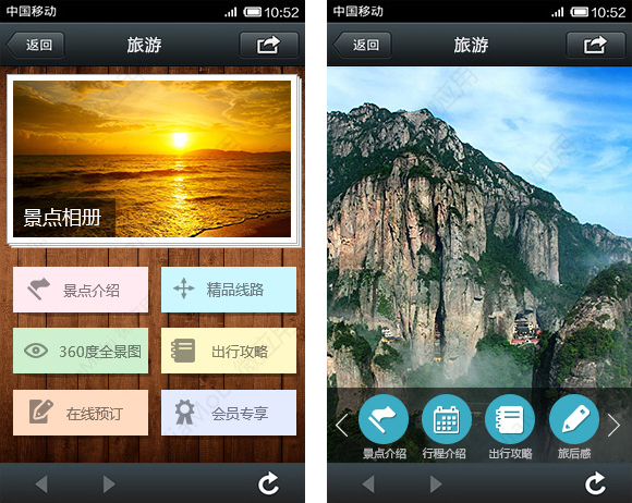 将线路的景点搬至手机上,可以是图片,更可以是360度的全景体验。提前做功课,提前感觉目的地的魅力。