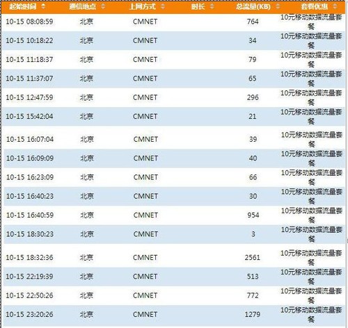 中国移动网上营业厅显示第一天15号使用了7516KB(7.34MB)流量