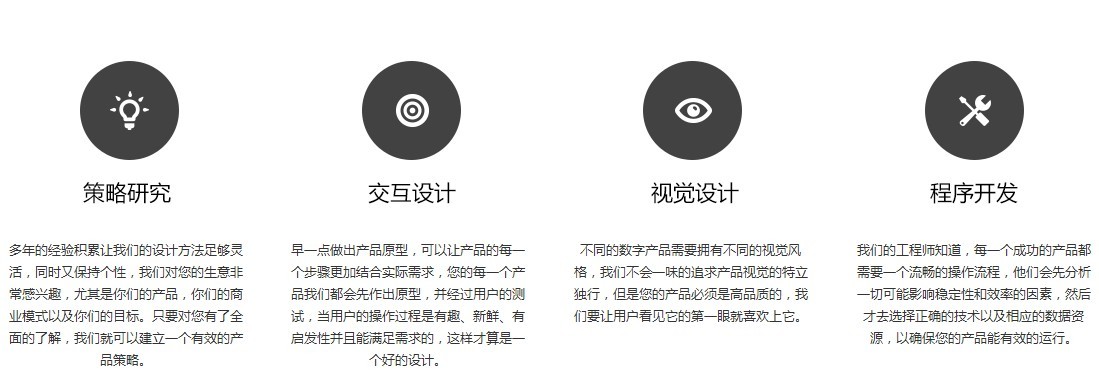 我们拥有一群擅长策略研究、用户体验、界面设计、程序开发的伙伴。拿到一个项目,我们先从客户的产品、公司、品牌入手,建立一个有效的策略,根据策略开始定义有效的信息架构和交互流程,得到客户的认可后我们就开始大量的细致入微的界面设计工作,随着界面设计的完成,我们的开发人员会立即启动相关功能的开发工作,于此同时,视觉设计师开始协同开发人员调试完成的功能界面,测试人员开始测试收集产品使用报告,以确保产品的高效率、高品质。测试通过后,我们会帮助客户提交产品到各个应用商店。