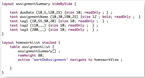 例如,表,Objective-C中,提供了一个大范围的功能,但并非没有引进很大的复杂性,使得开发商很难迅速实现预期的行为底线。 像或Canappi的MDSL对比的DSL简洁地捕捉表的开发者希望呈现一个简单的描述: