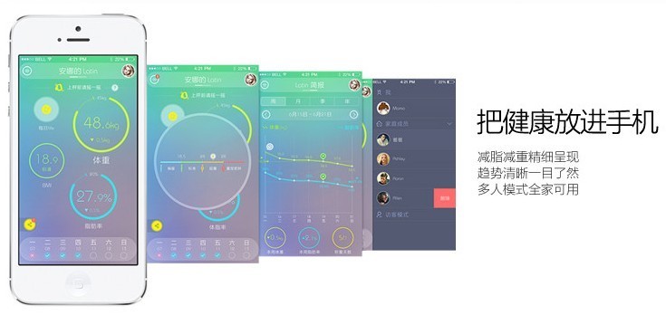 1、测量体重 2、健康指数反馈 3、深度报告 4、家庭模式 5、远程共享 6、社交分享