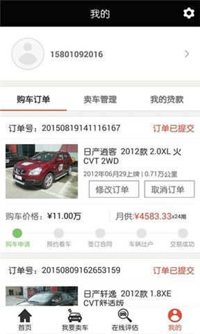 4、个人中心:购车订单,卖车管理,我的贷款,一目了然。