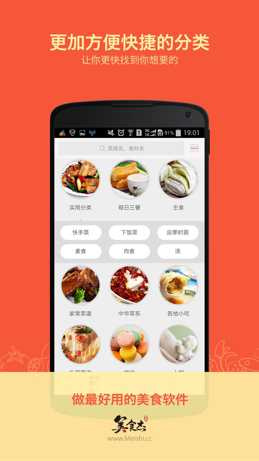 菜谱大全、中华菜系、外国菜谱、药膳食疗、厨房百科五大栏目下细分164个小栏目,特色分类满足你不同需求。