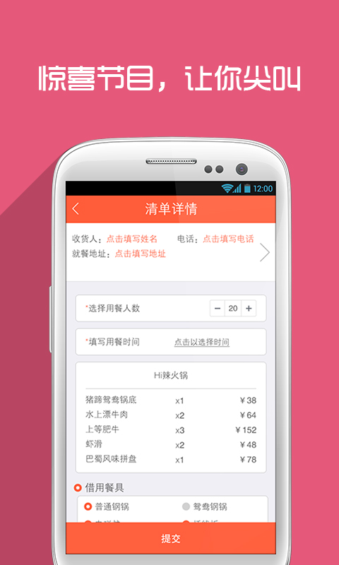为用户提供火锅美食到家服务,在挑食上可以选择包括金簋小山城、香天下四川火锅、Hi辣火锅、赵香兰南洋火锅铺、重庆小天鹅火锅、麒麟锦庭火锅道、老诚伊羊蝎子、八巴兔重庆火锅、烹然四季椰子鸡火锅、滇草香云南原生态汤火锅、箩箩酸汤鱼火锅、杨家秘笈重庆火锅、珍菇源健康营养火锅在内的二十余家、不同特色火锅美食,挑食为用户提供火锅到家的餐前、餐后服务。