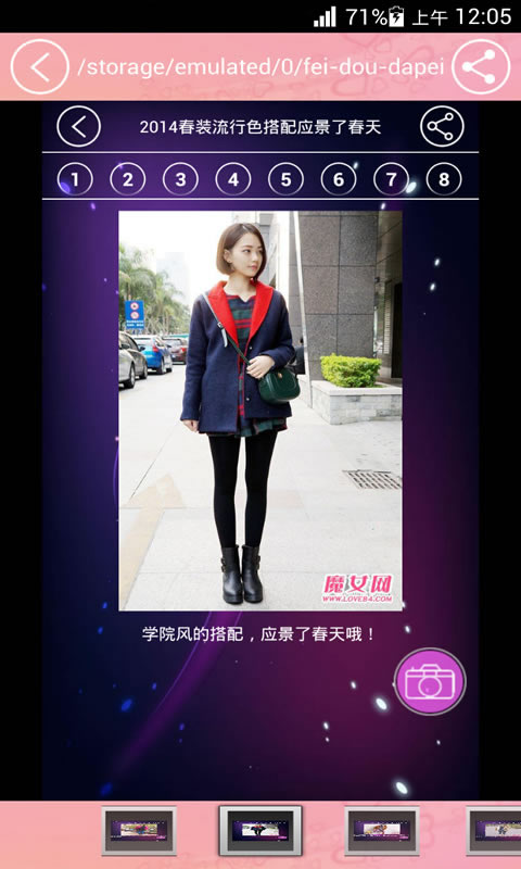 俗话说:人靠衣服,马靠鞍! 还在为穿什么衣服绞尽脑汁吗?还在为新买的衣服着急怎么搭配吗? 该应用以服装搭配为素材,介绍服装在不同场合下的搭配方法以及服装颜色搭配方式。主要分为服装搭配、颜色搭配两大类。让你在不同季节、不同场合都能与众不同,吸引众人的目光。 应用介绍搭配原则,以图片展示为主,附上文字介绍,清纯、成熟、性感、迷人...想要什么风格,就可以让你穿出什么风格。对于自己喜欢的搭配,可以通过微博、短信等方式分享给好友,让更多的人穿出自己的style!
