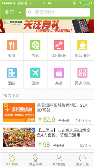3.筛选:可按团购分类、地理位置、团购范围筛选,可按距离、人气等排序,快速帮您定位团购信息。