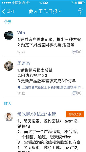 1.自动形成每位成员的工作日报,便于团队内快速达成和了解工作进度;