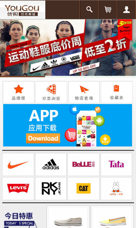 优购网-时尚服饰鞋包网购首选经营耐克、阿迪达斯、Kappa、匡威、百丽、他她、天美意、森达等众多知名品牌100%专柜正品免费送货10天退换货提供愉悦购物体验!