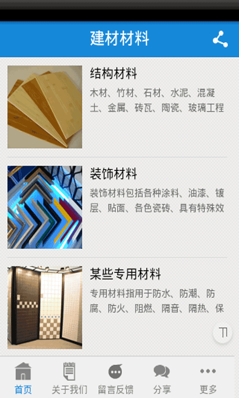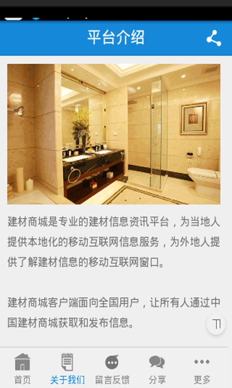 此建材商城APP开发中有关于建材的最新资讯、建材的分类、一些建材的知识,还有相关的建材公司,致力于打造全国性的建材平台。若你想要了解关于建材的采购和公司即可下载此APP客户端。建材商城APP中存在你需要的商品,想了解的知识。欢迎广大需要者使用!