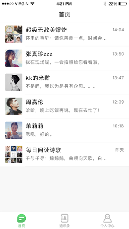 ④群聊:群聊列表,显示已有的群聊名称,点击可进入群聊天详情