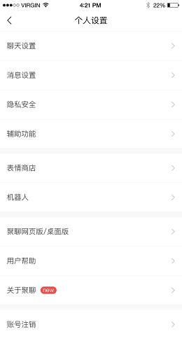 ⑤个人设置:聊天设置、消息设置、隐私安全、辅助功能、表情商店、机器人、聚聊网页版/桌面版、用户帮助、关于聚聊、账号注销等功能设定