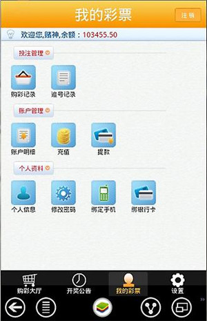 3.我的彩票——账户明细,余额查询,投注记录查询,充值提现,个人信息,密码修改,手机号码和银行卡的修改与绑定;