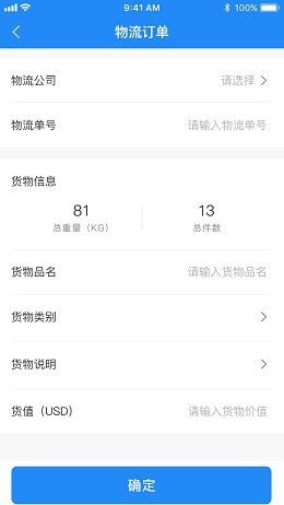 ②物流订单:可添加物流订单:选择物流公司、输入物流单号、总重量、总件数、品名、选择类别、选择货物、输入货值、备注,确定