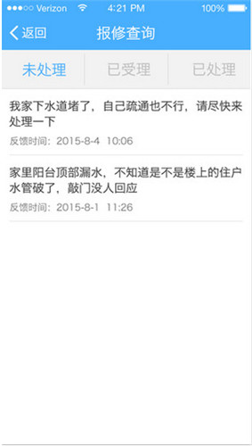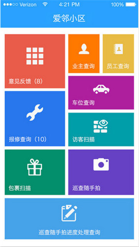 1.意见反馈查询;2.报修查询;3.业主查询;4.员工查询;5.车主查询;6.访客扫描;7.包裹查询;8.巡查随手拍。