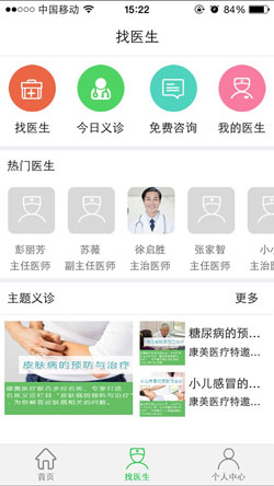 1、找医生:随时随地咨询名医,在线、电话任您选择,还可以定制您的私人医生;