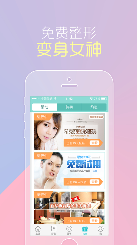 2、福利:免费整形活动周周有、1元抢拍整形天天送!