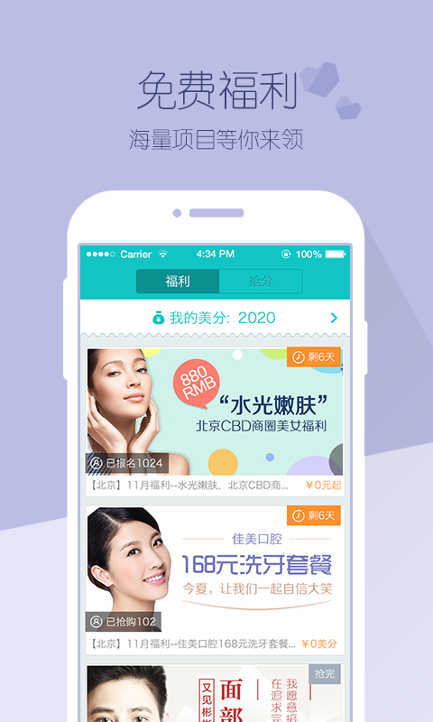 2,【海量免费项目】水光美肤、焕白洗牙、美分换礼,高频率的免费项目体验。