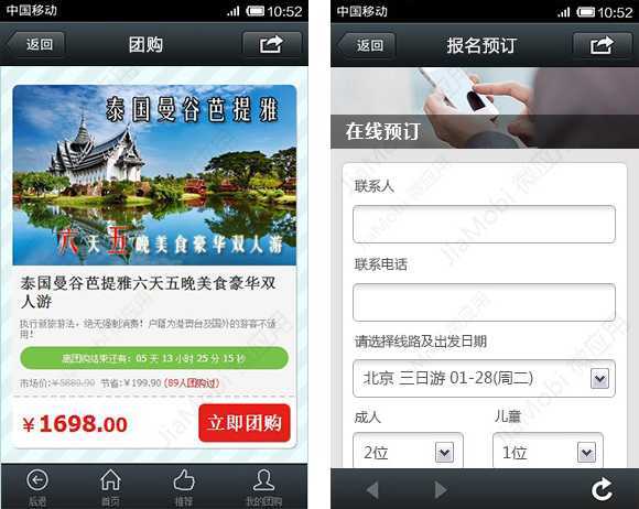 对热门的旅游线路更可以发起团购;旅行团的微信报名跟团;还可以将所有旅游服务线上化,实现旅游产品的在线下单。