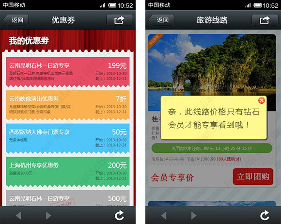 除了公开价,更可以根据会员不同的等级设计不同的价格体系;还能 将将一些针对老会员的特惠线路有选择的开放给某些会员看到;向会员发行不同价值的优惠卷,促进成交。