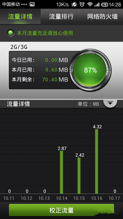 至于马头流量,它的结果表现最为怪异,软件显示总流量为4.44MB,减去不在测 试日期内的14号的2.9MB流量,也就是说笔者15、16号两天只用了0.54MB。不仅如此 ,其软件内还并未显示出15号的流量状况,而16号的流量状况则为0。