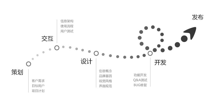 我们拥有一群擅长策略研究、用户体验、界面设计、程序开发的伙伴。拿到一个项目,我们先从客户的产品、公司、品牌入手,建立一个有效的策略,根据策略开始定义有效的信息架构和交互流程,得到客户的认可后我们就开始大量的细致入微的界面设计工作,随着界面设计的完成,我们的开发人员会立即启动相关功能的开发工作,于此同时,视觉设计师开始协同开发人员调试完成的功能界面,测试人员开始测试收集产品使用报告,以确保产品的高效率、高品质。测试通过后,我们会帮助客户提交产品到各个应用商店。