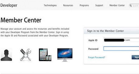 回归正题,发布iOS应用程序到App Store 需要一些必要的前期工作,首先需要一个iOS developer帐号,账号是收费的,$99美元/年。即便是免费应用也需要一个开发者账号,注册Developer账户这里就不详细介绍了。注册后并登录到苹果MemberCenter,见下: