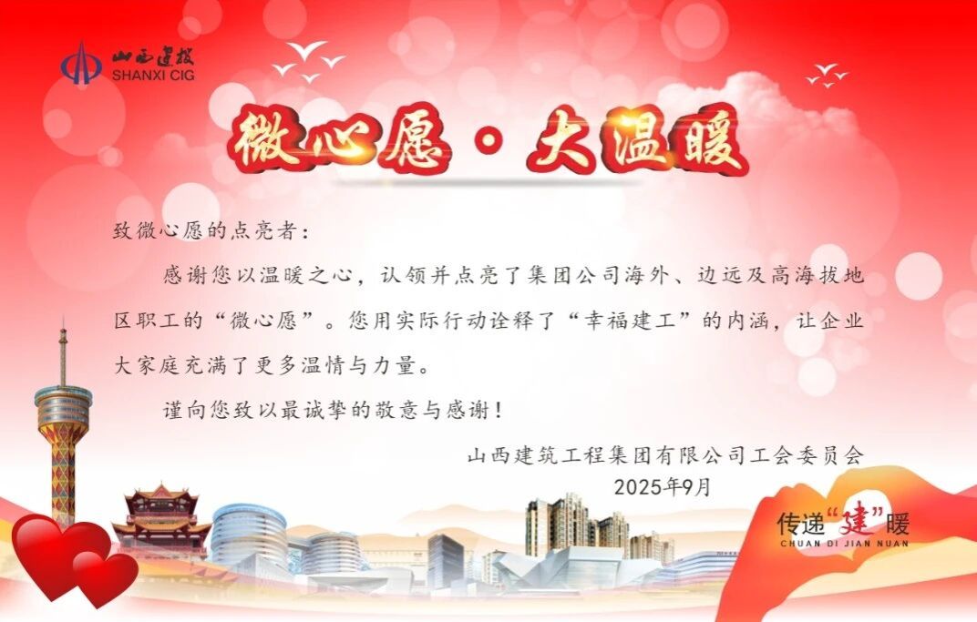 在遥遥海岛,在巍巍高原,在茫茫戈壁,有一群默默坚守的山西建工人。他们以项目为家,与风雨为伴,用双手拼搏,却因职责所在,与家乡相隔千里。为传递企业的温暖,回应职工的期盼,近期,集团公司工会积极响应上级工会安排,发起了一场面向海外、边远与高海拔地区职工的“点亮微心愿”活动,以心传情,书写了一篇跨越山海的暖心故事。