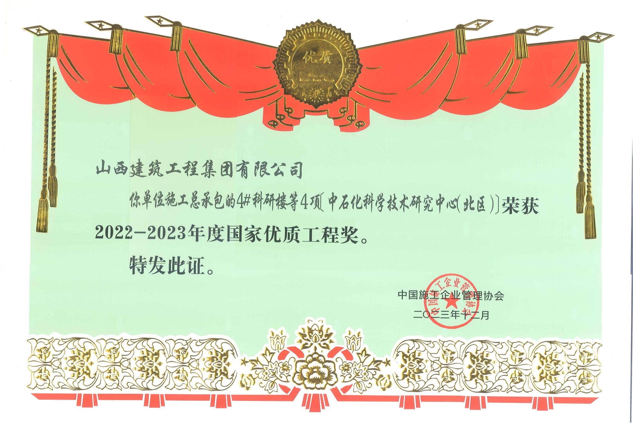 4#科研楼等4项中石化科学技术研究中心(北区)—国家优质工程奖证书