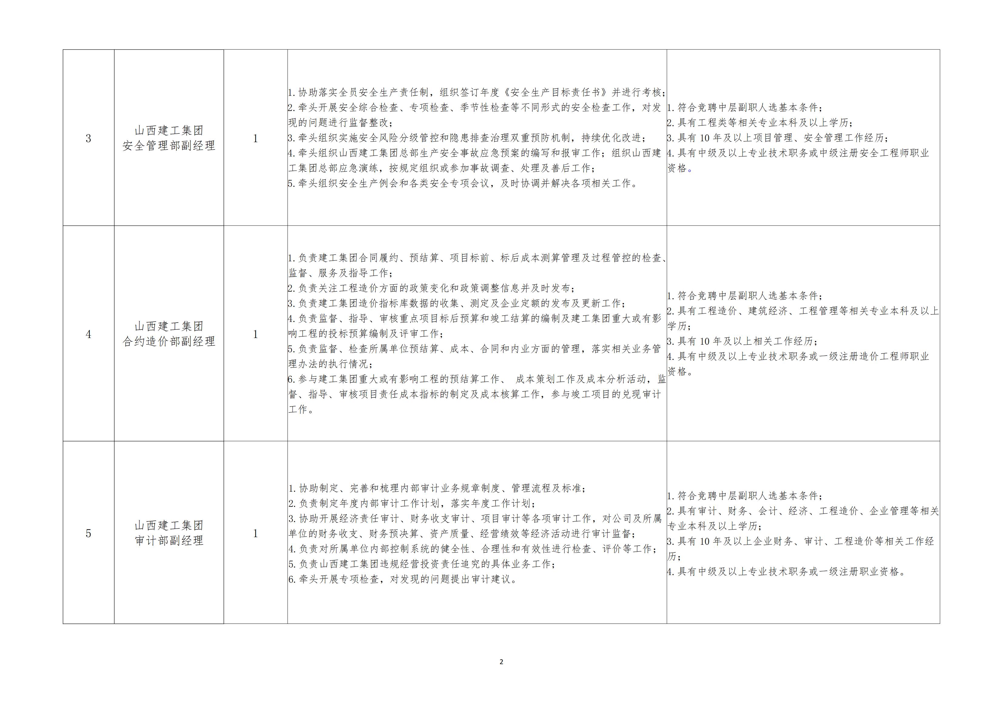 根据《山西建投集团“六定”改革长效机制实施方案》《集团公司所属单位“六定”改革实施方案》,结合山西建投集团整合施工类分公司组织机构的指导意见,为进一步提高企业管理运行效率和质量,配齐配强基层单位领导班子,山西建工集团党委决定对部分基层单位的领导班子副职开展竞聘上岗,公告如下: 一、竞聘职位和人选范围 (一)本次竞聘职位共5个:山西建工集团华南公司副总经理3人、山西建工集团西南公司副总经理2人。 ...
